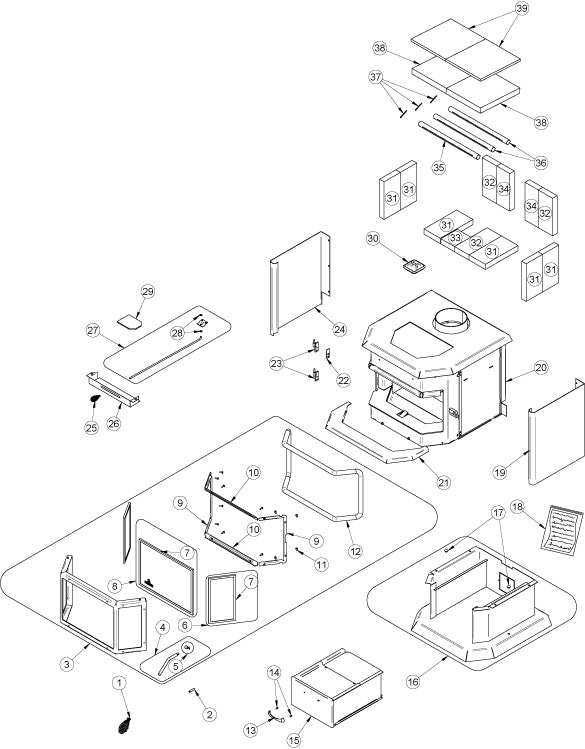 Serial number 801518 and more. Osburn 1800 Wood Stove Parts Diagram. Select the image number for the part you would like to order from option menu on the top right side of this page. If you need any help, please call 516 974 9742 AC07868 1/2 " BLACK COIL HANDLE, 2 30112 SPRING PIN 5/16"x1 3/8", 3 SE37150 DOOR ASSEMBLY WITHOUT OVERLAY, 4 AC26005 DOOR HANDLE AND LATCH KIT, 5 AC09185 DOOR LATCH KIT, 6 SE37154 5 3/8''x10 13/16" REPLACEMENT GLASS WITH GASKET, 7 AC06400 BLACK SELF-ADHESIVE GLASS GASKET KIT (6'), 8 SE37155 REMPLACEMENT GLASS WITH GASKET 14 3/4''x10 13/16'', 9 PL37151 RIGHT OR LEFT GLASS RETAINER, 10 PL37134 FACEPLATE RIGHT SIDE 32"x44", 11 30026 THREAD CUTTING SCREW 10-24 F 5/8" HEX WASHER HEAD, 12 OA11390 SILICONE & DOOR GASKET REPLACEMENT KIT 7/8" (8 FEET), 13 28062 BLACK DRAWER HANDLE 3 25/32", 14 30108 MECHANICAL SCREW M4x8MM PAN PHILLIPS ZINC, 15 SE37037 PEDESTAL ASH DRAWER, 17 30418 FINISHING PLUG 3/8", 18 SE45059 INSTRUCTION MANUAL, 19 PL37018 RIGHT DECORATIVE PANEL, 21 PL37025 ASH SHELF, 22 PL35056 SHIM, 23 SE35021 HINGE ASSEMBLY, 24 PL37019 LEFT DECORATIVE PANEL, 25 AC07866 1/4 " BLACK COIL HANDLE, 26 PL37029 AIR CONTROL COVER, 27 SE34024 AIR CONTROL ROD ASSEMBLY, 28 30063 1/4" ID PUSHNUT, 29 SE37035 AIR CONTROL PLATE, 30 SE16059 ASH DUMP PLUG, 31 29001 4''x8''x1 1/4'' REFRATORY BRICK HD, 32 29011 4''x9"x1 1/4" REFRACTORY BRICK HD, 33 VP00016 3 1/2''x4''x1 1/4'' REFRACTORY BRICK, 34 PL36027 3"x9"x1 1/4'' REFRACTORY BRICK, 35 PL37031 FRONT SECONDARY AIR TUBE, 36 PL37030 REAR AND MIDDLE SECONDARY AIR TUBE, 37 30068 STAINLESS STEEL COTTER PIN 1/8"x1 1/2", 38 21295 C-CAST BAFFLE 10 7/8"x9 7/16"x1 1/4", 39 PL37027 1"x9 5/8"x1/2" RIGID BAFFLE INSULATION