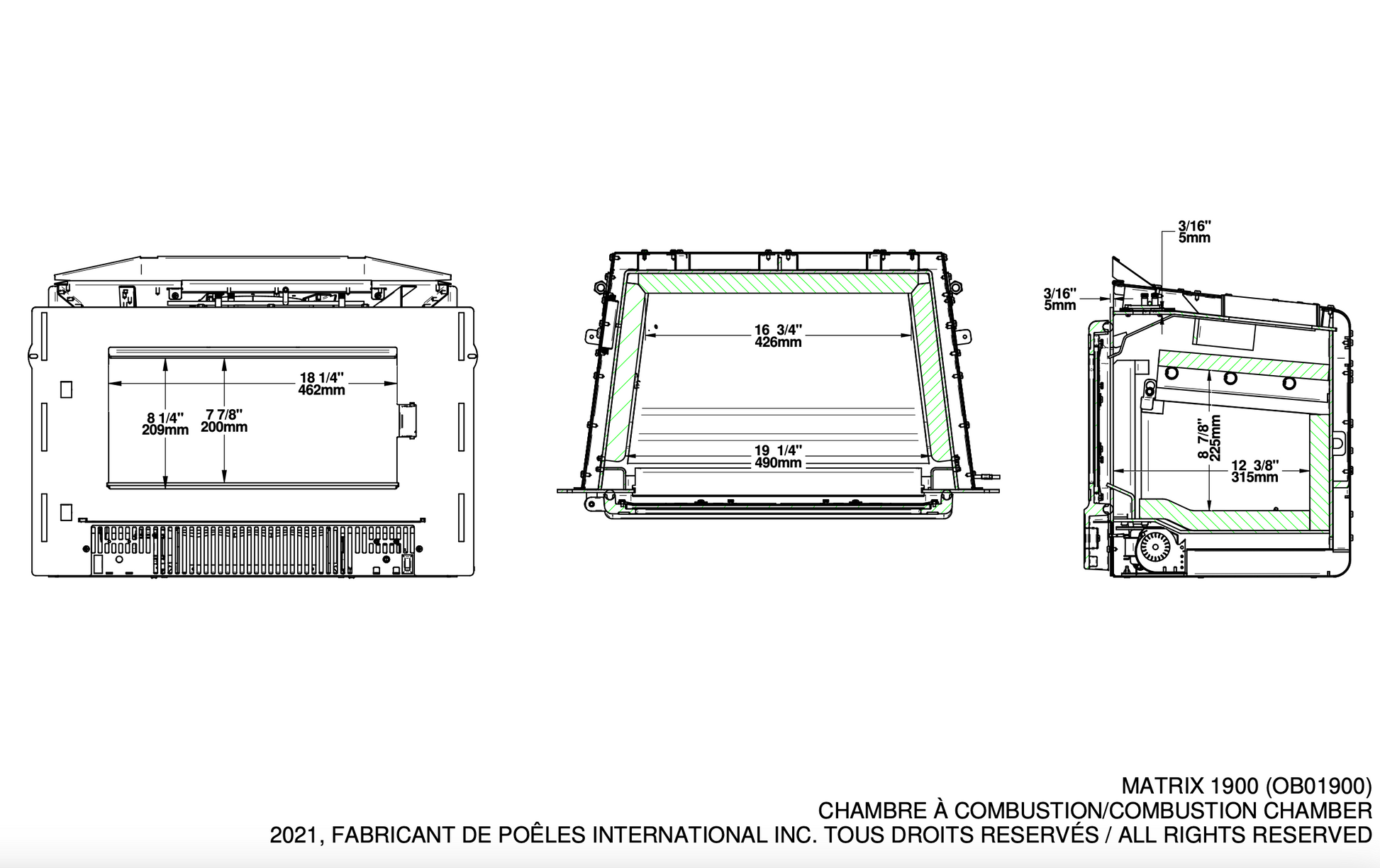 The Matrix 1900 is a compact unit that has tapered top and sides for easy installation in smaller hearths. The deep bottom of its combustion chamber allows ash to accumulate and reduces the frequency of cleaning.