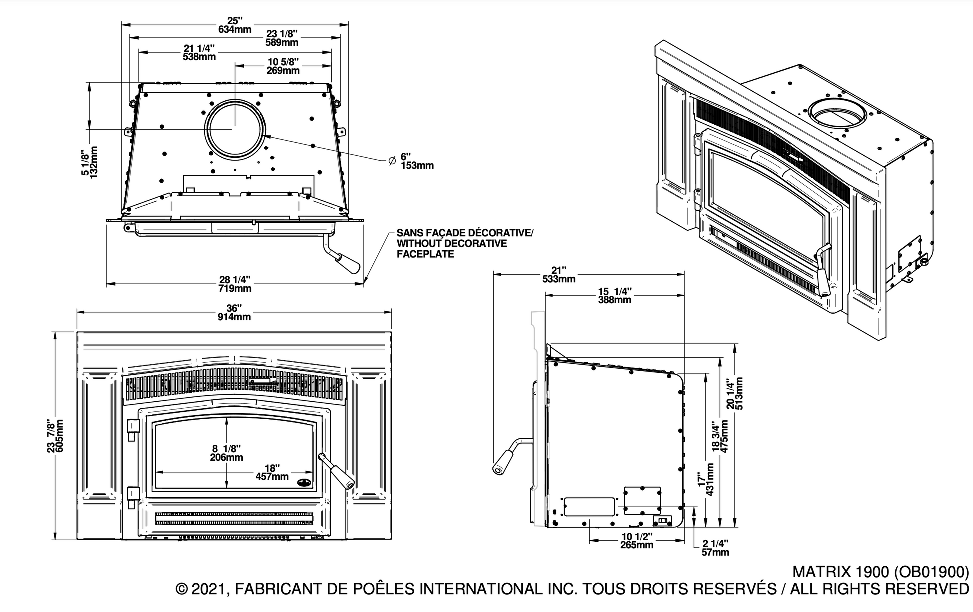 Treat your family to incomparable comfort with the Matrix 1900 wood-burning insert. Its magnificent cast-iron faceplate is adorned with a patterned upper louver and columns that frame its large door. Its discreet black wooden handle, air control with removable handle as well as flush mount blower disappear to leave room for the delicate details of its faceplate. Its large glass surface highlights a panoramic view of the flames to fully enjoy your moments near the fire.