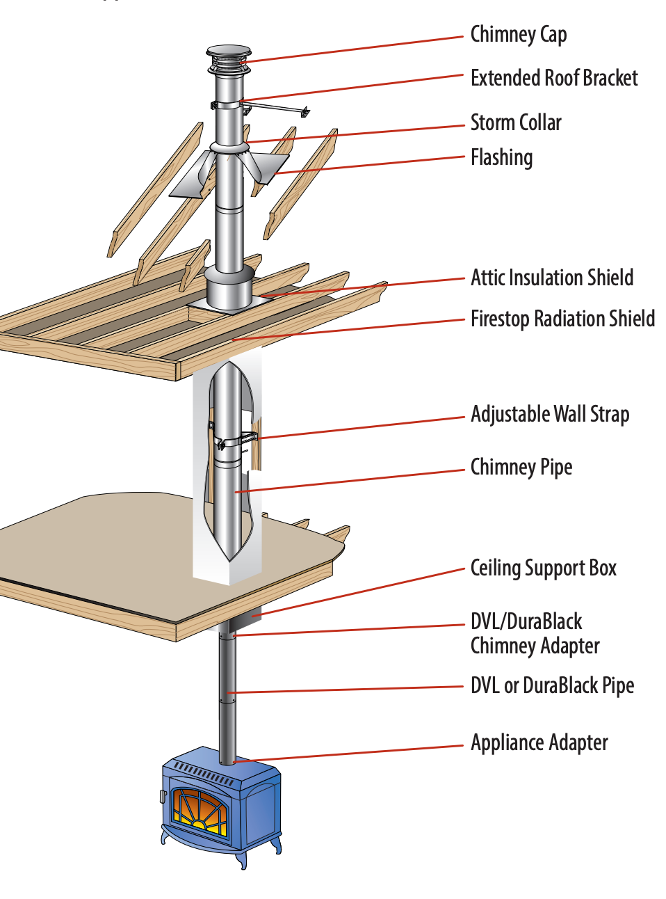 1 foot of 6 inch diameter, stainless steel, class A insulated stove pipe or double wall black pipe.